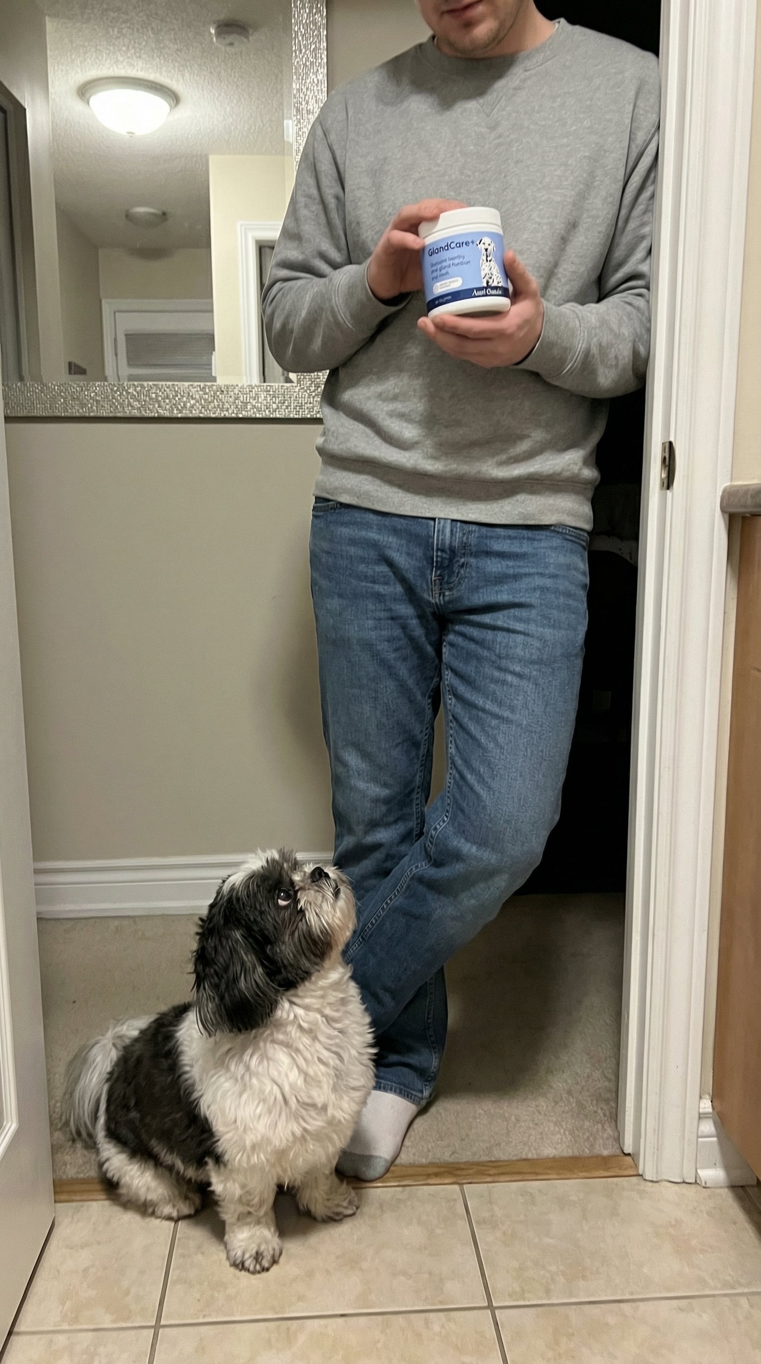 My dog refuses most supplements, but he thinks these are treats. Within a couple of weeks, the constant butt licking stopped and walks are comfortable again. Simple, clean solution that actually works.